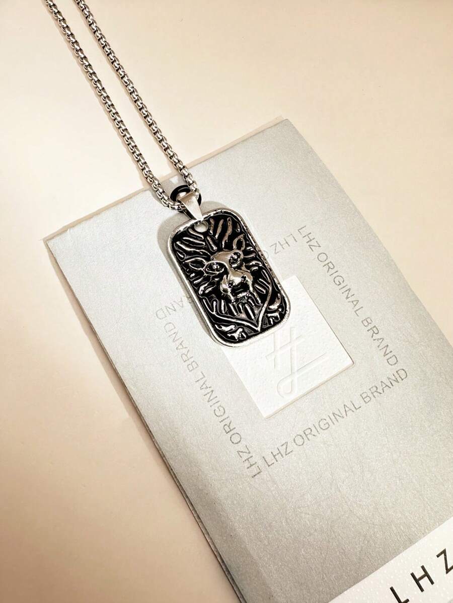 1pc Fashionable Personalized Retro-Style Square Pendant & Bold Lion Head Shaped Stainless Steel Necklace, Suitable For Men, Couple, Everyday Wear, Valentine's Day Gift, Stackable