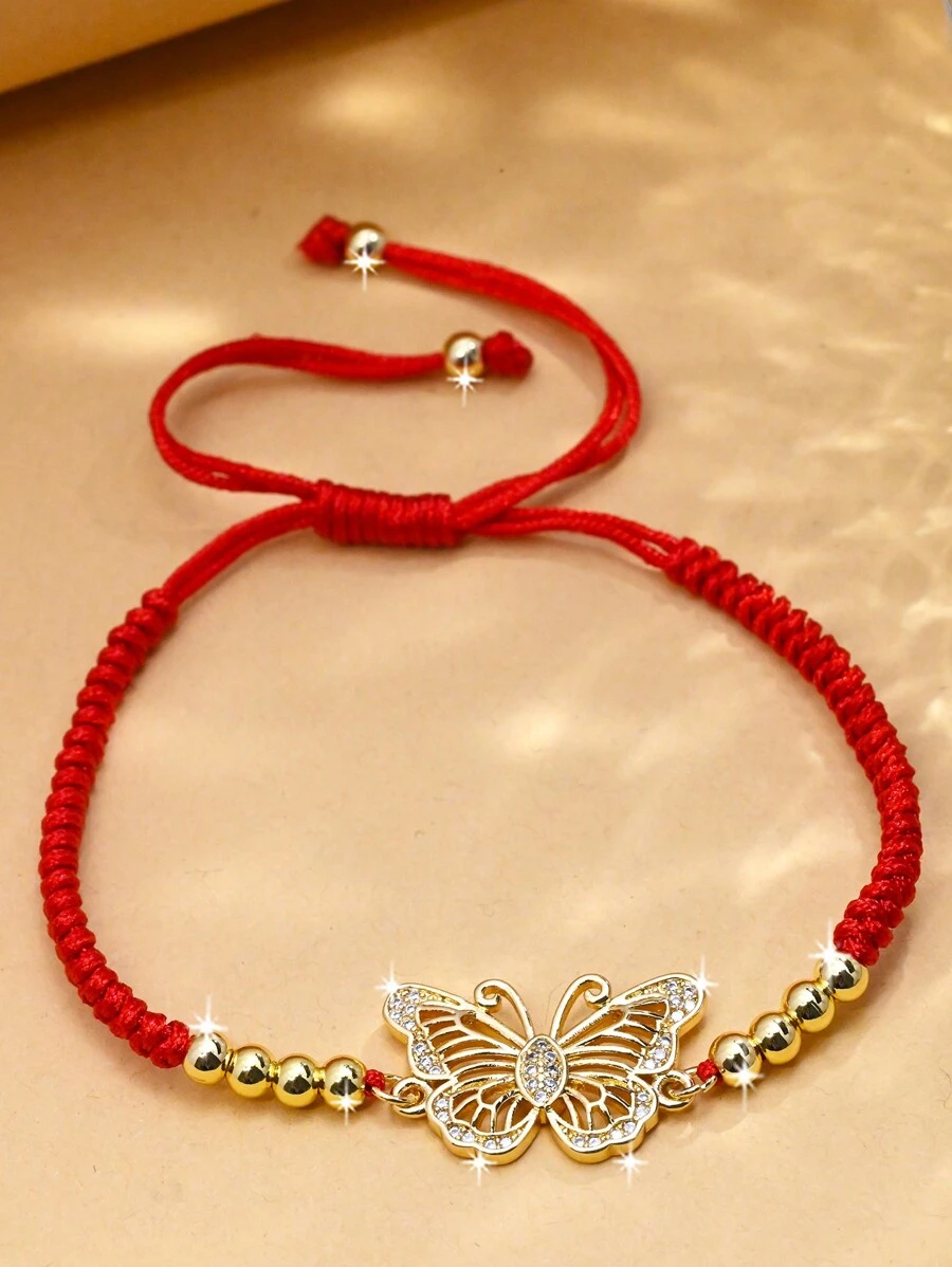 1pc Fashionable Red Rope Lucky Knot With Butterfly & Rhinestone Chain Bracelet Suitable For Parties & Festivals As A Gift