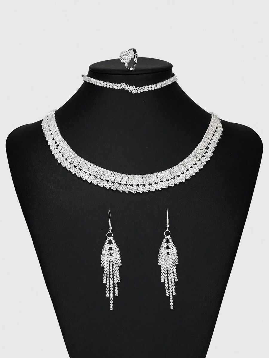 1pc Fashionable Rhinestone Decorated Open Ring With Earrings And Necklace Set Suitable For Daily Wear For Women