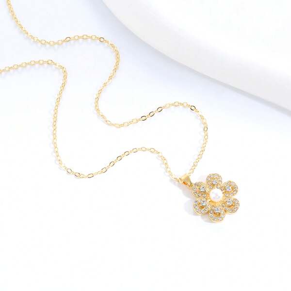 1pc Fashionable Shiny Rhinestone & Pearl Pendant Necklace For Women, Elegant Flower Clavicle Chain Jewelry For Party Dress Accessories