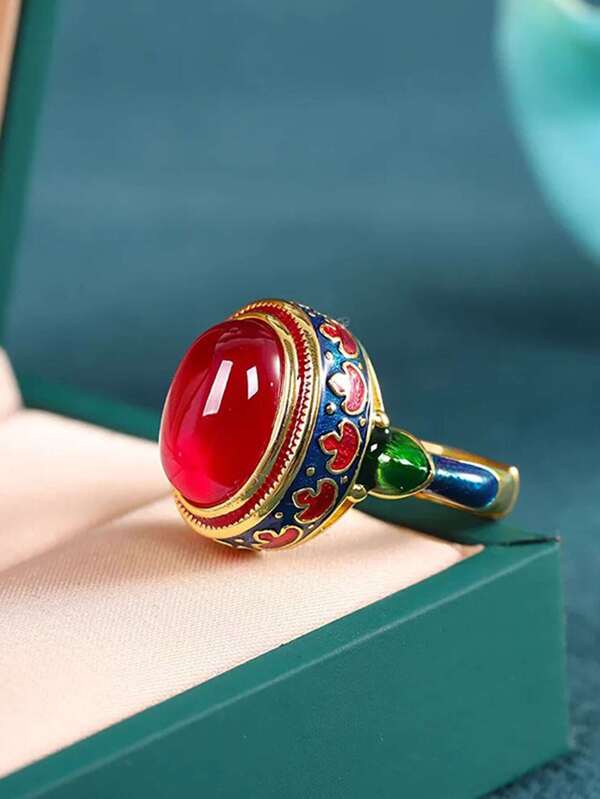 1pc Fashionable Vintage Enamel Flower Design Luxurious Ruby Ring Suitable For Women