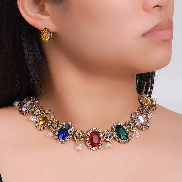 1pc Fashionable Vintage Glass Inlaid Concise Women'S Neck Chain & 1pair Vintage Elliptical Women'S Stud Earrings