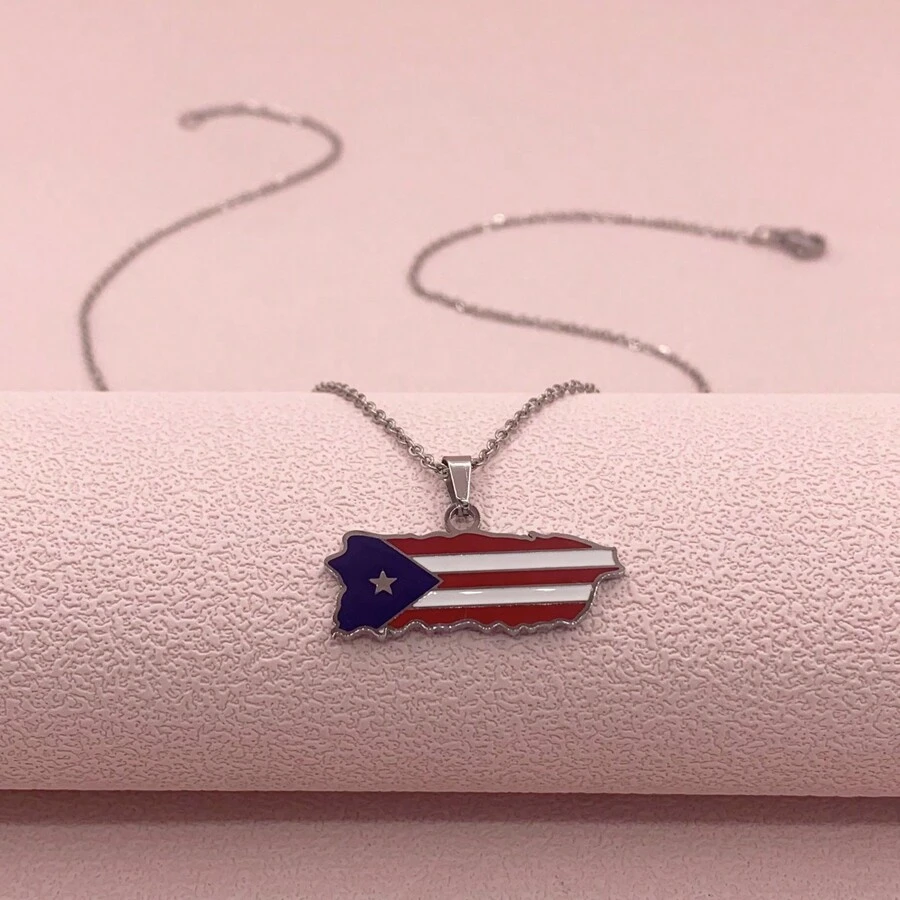 1pc Fashionable Women's Silver Stainless Steel Puerto Rico Flag Design Pendant Necklace
