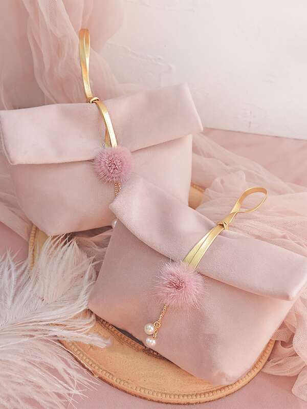 1pc Faux Pearl & Pom Pom Decor Gift Bag, Pink Polyester Gift Packing Bag For Wedding Holiday Party