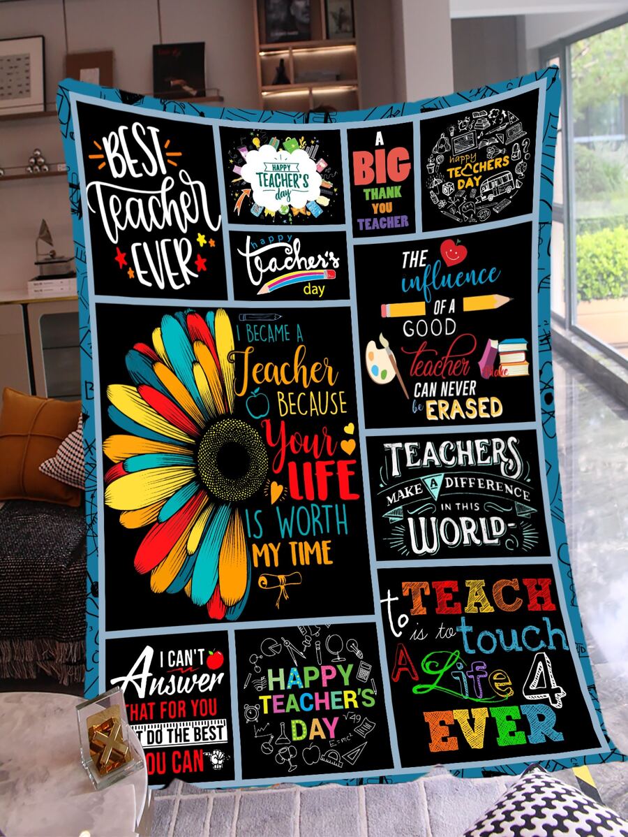 1pc Floral & Slogan Graphic Flannel Blanket