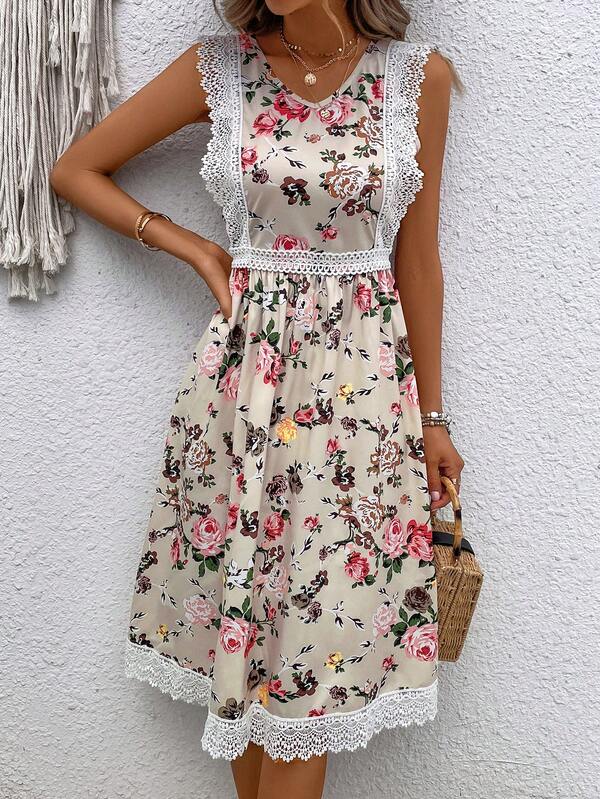 1pc Floral Print Contrast Lace Dress