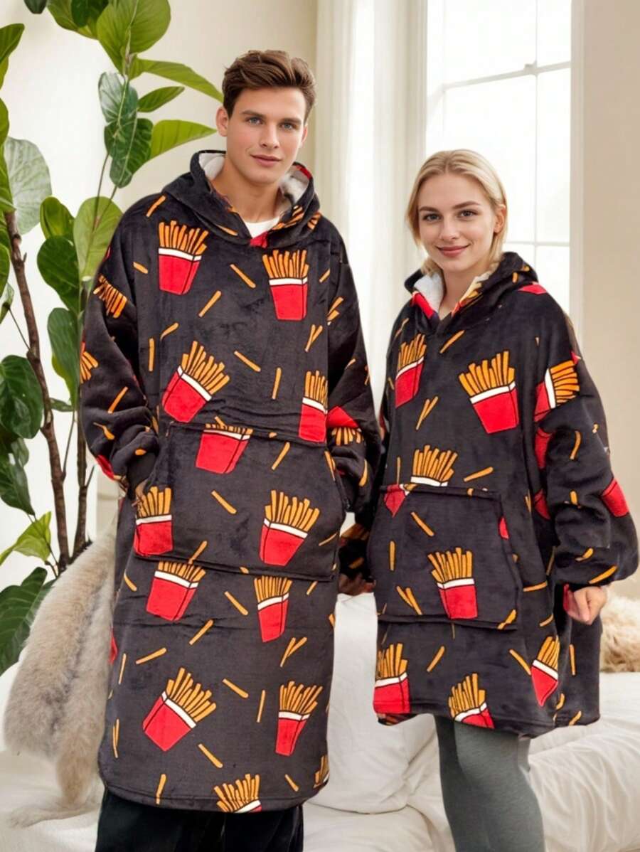 1pc French Fry Printed Hoodie Blanket, Flannel, 48inch Extra Large Loose Casual Hooded Wearable Couple Throw Blanket, Suitable For Men And Women, Sleepwear