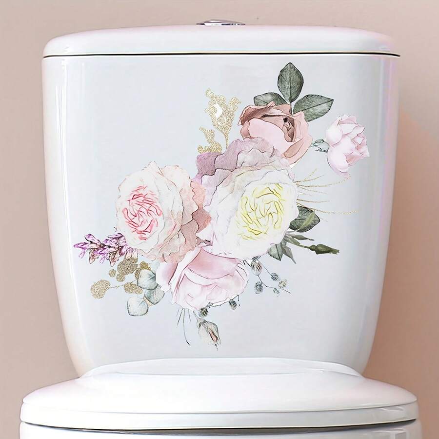 1pc Fresh Flower Toilet Sticker Pink Rose Removable Waterproof Vinyl Decal For Toilet Lid Tank Home Decor, 7.87*11.42in