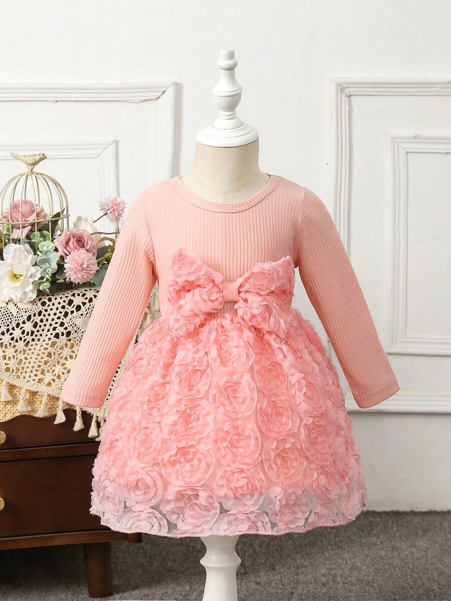 1pc Girls' Elegant Rose Mesh Autumn Dress For Baby Girls