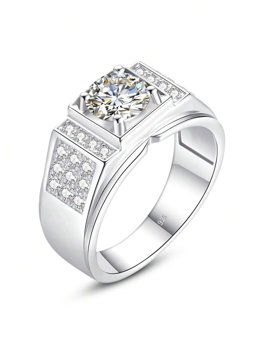 1pc Glamorous Sterling Silver Laboratory-created Moissanite Decor Silver Ring For Men For Wedding