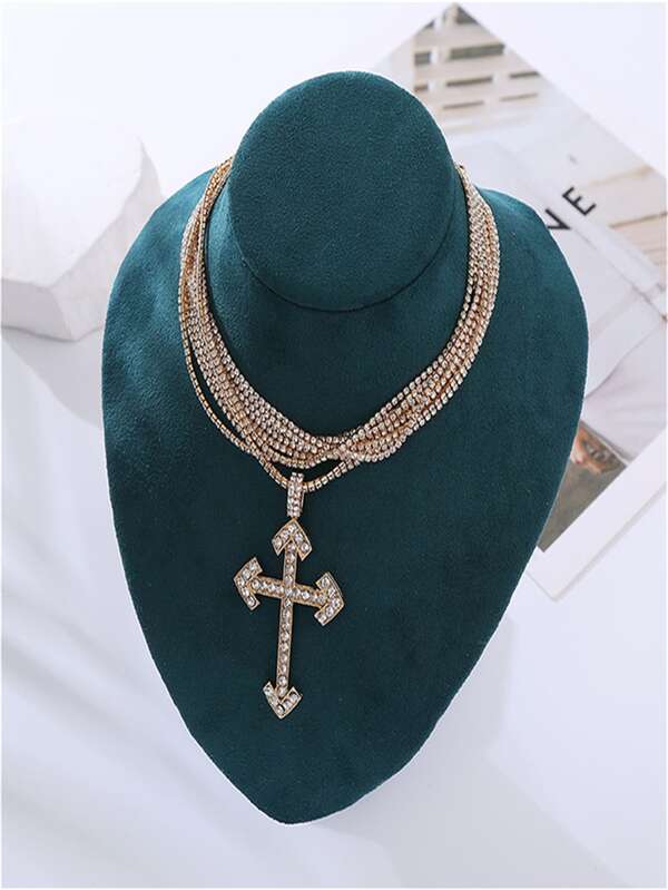 1pc Golden European And American Style Exaggerated Multi-layered Rhinestone Encrusted Cross Pendant Necklace, Party Jewelry For Clavicle