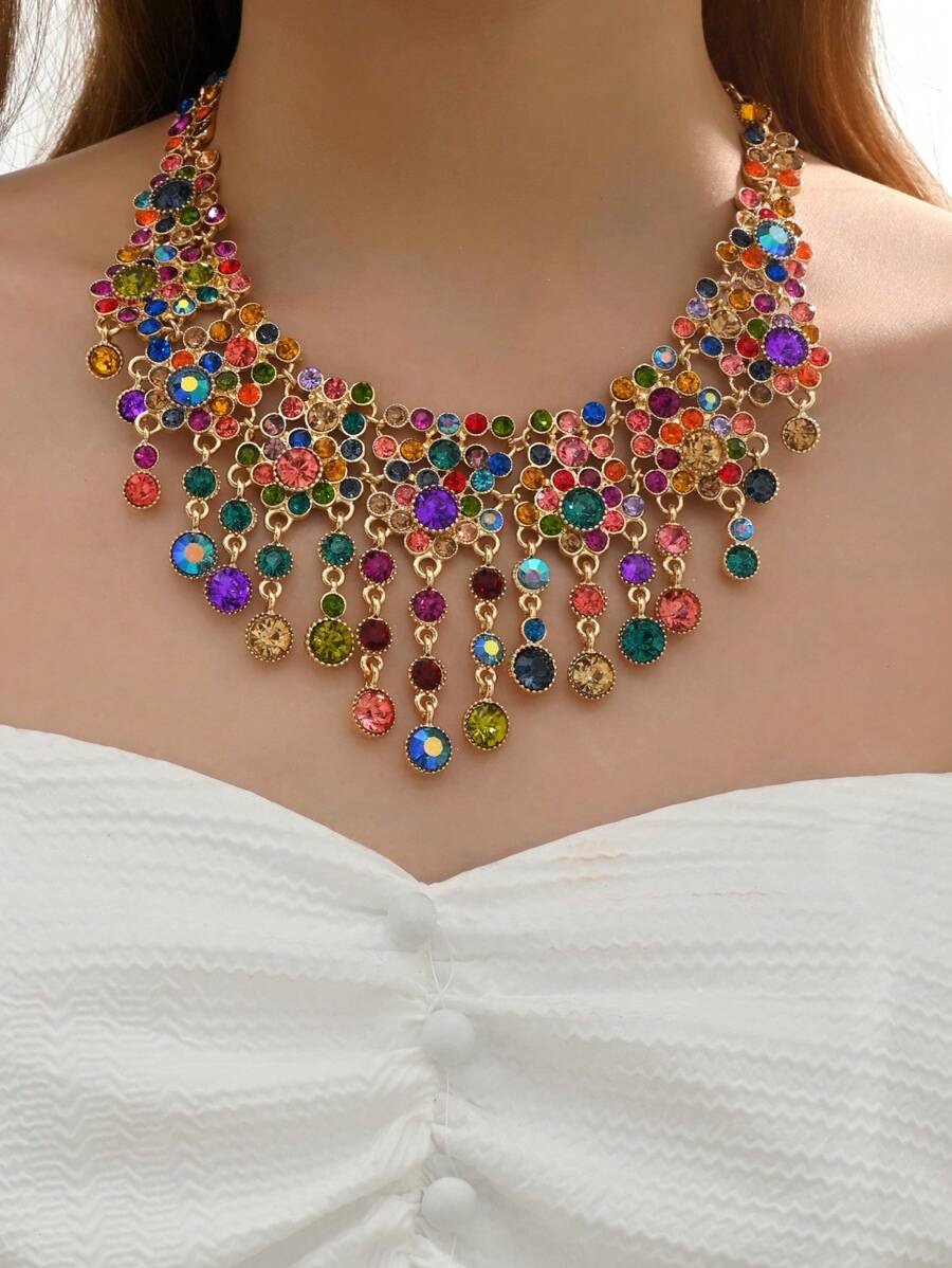 1pc Gorgeous Lovely Colorful Rhinestone Flower Tassels Bib Necklaces Luxury Elegant Sweet Jewelry For Women&Teen Girls