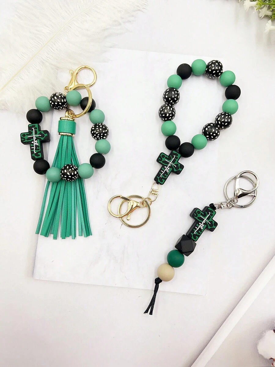 1pc Green Camo Silicone Cross Pendant Wood Bead Tassel Keychain, Wristband, Keyring, Bracelet, Bag Accessory