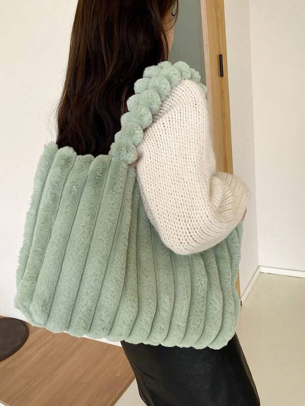1pc Green Plush Stripe Design Tote Bag With Large Capacity And Furry Ball, Suitable For Women'S Daily Use