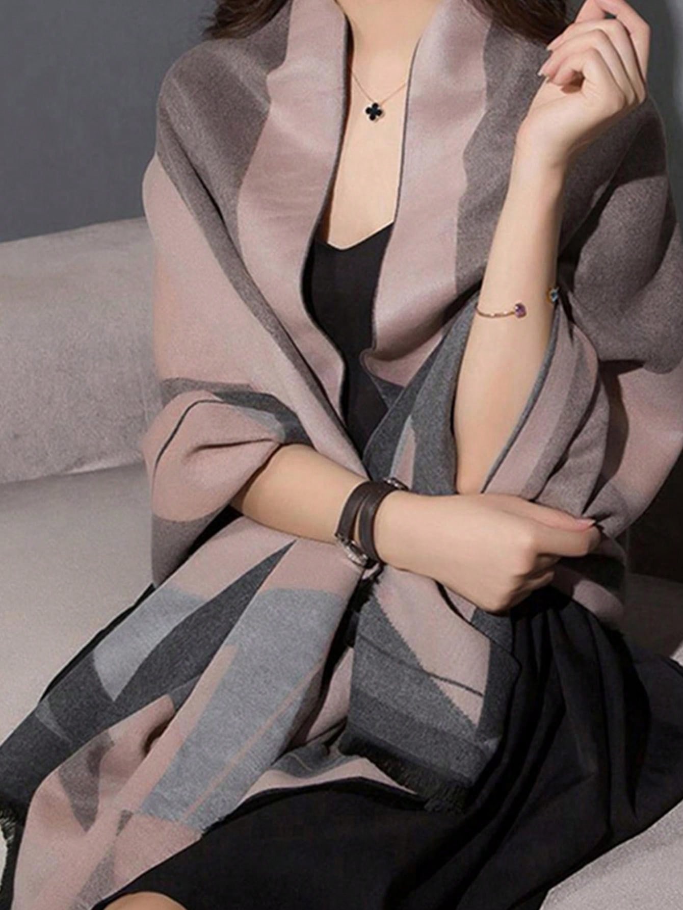 1pc Grey Women Cashmere Feeling Color Block Long Shawl Scarf, Geometric Pattern Keep Warm Wool Fashion Scarf, For Autumn Winter Daily Life