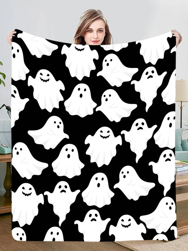 1pc Halloween Throw Blankets Funny Ghost Cute Halloween Spooky Black and White Throw Blanket Lightweight Cozy Flannel Blanket for Bedroom Living Rooms Couch Sofa Bed Home Decorations