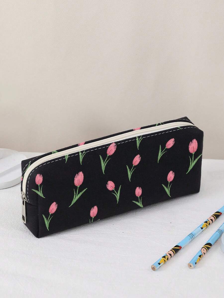 1pc Hand-Painted Flower Pattern Double-Sided Printed Flannel Pencil Case