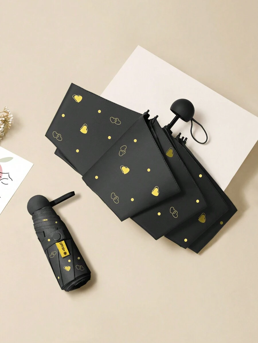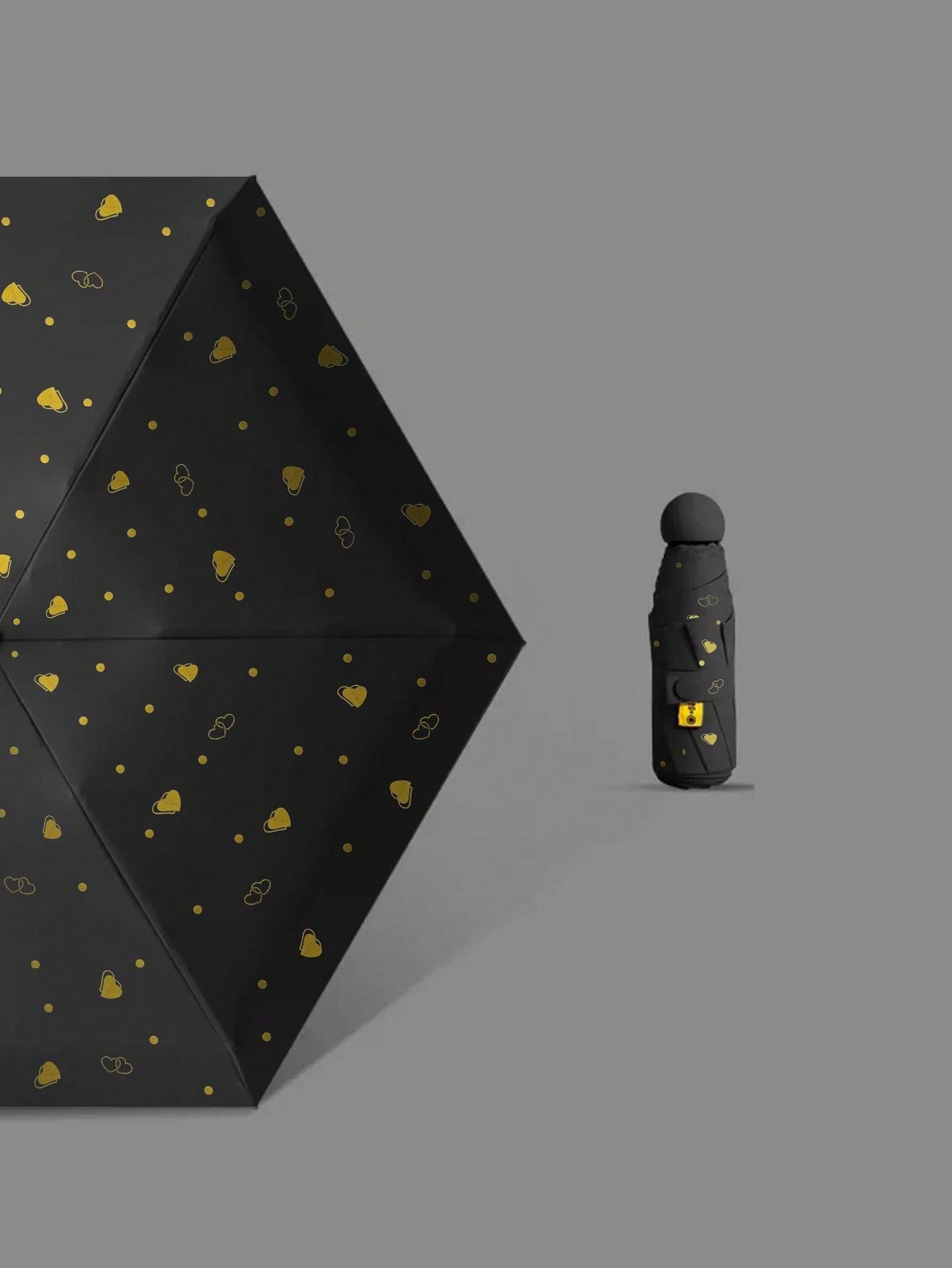 1pc Handheld Umbrella, Black Base Color, Stamp Gold Heart Pattern, Simple And Stylish Style, 6folding Umbrella, Mini, Lightweigh, Easy To Open And Close, Easy To Carry In Pockets Or Bags, Suitable For Both Sunny And Rainy Days, Can Block Ultraviolet Rays, Thickened Umbrella Fabric, Thickened Black Glue, Reinforced Umbrella Frame