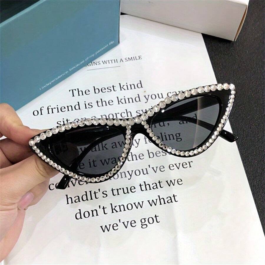 1pc Handmade Black Diamond-Encrusted Dj Triangle Cat Eye Sunglasses For Phototaking, Sun Protection