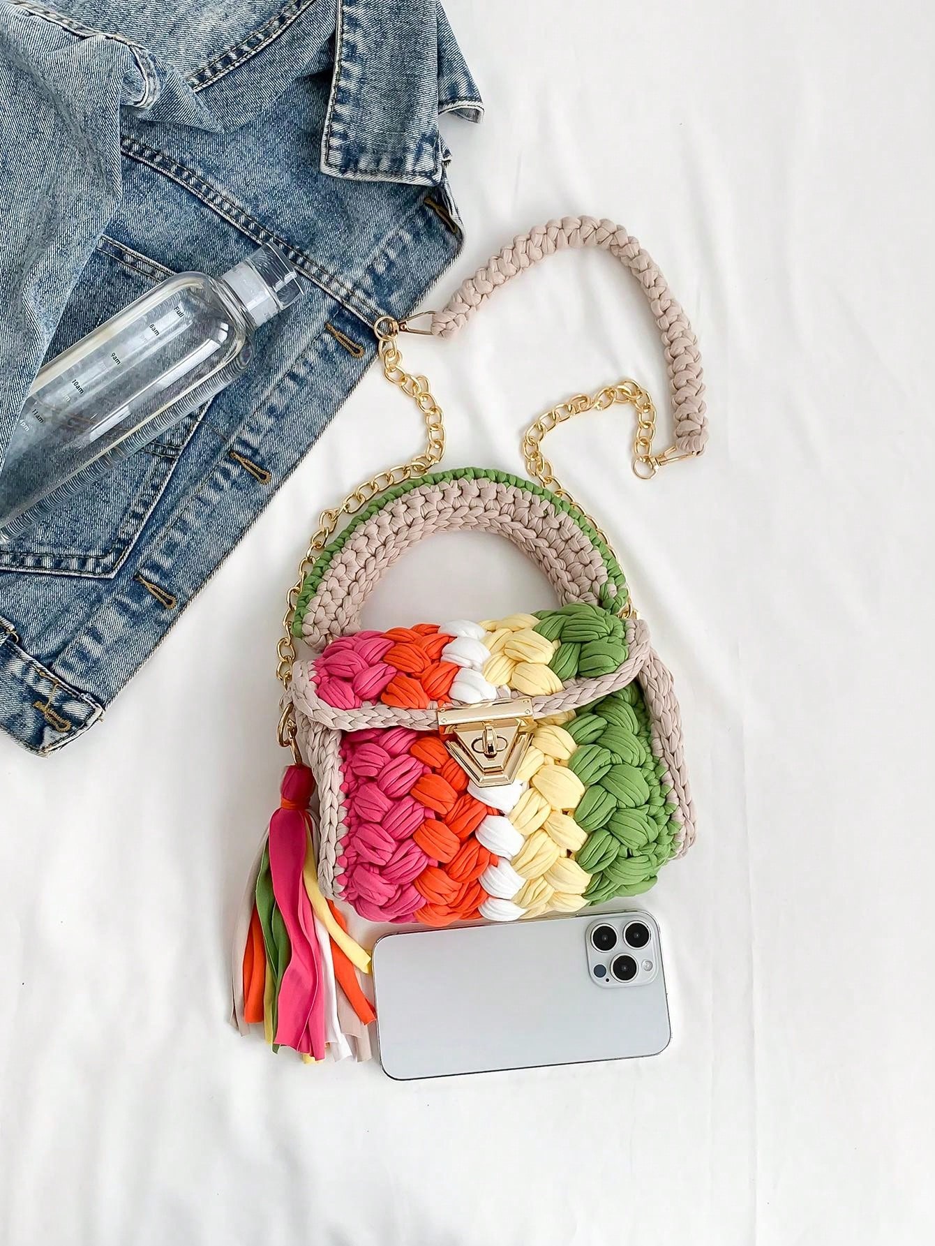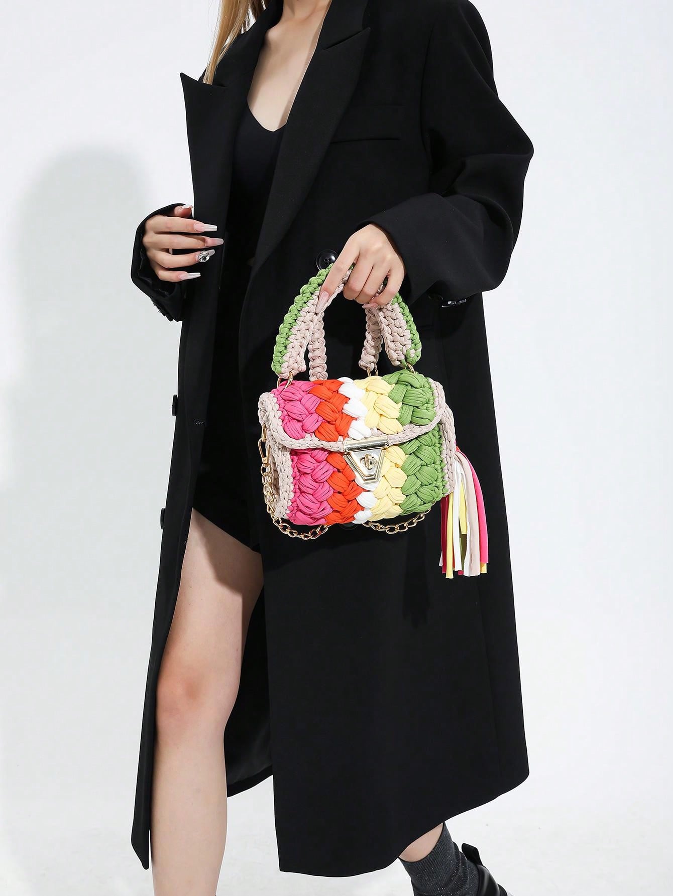 1pc Handmade Crochet Strip Multicolor Khaki Shoulder Bag, Color Blocking Design, Trendy And Minimalist Square Shape, Detachable Chain Handle, Large Capacity, Perfect For Daily Use, Party And As A Gift For Friends