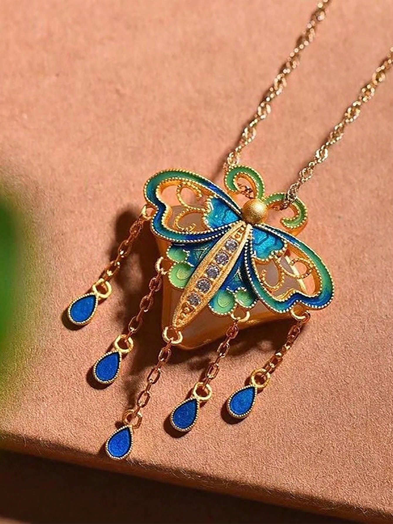 1pc Handmade Pendant With Traditional Hetian Jade And Enamel Inlaid, Decorated With Butterfly Tassel, Suitable For Chinese Style Daily Wearing By Women