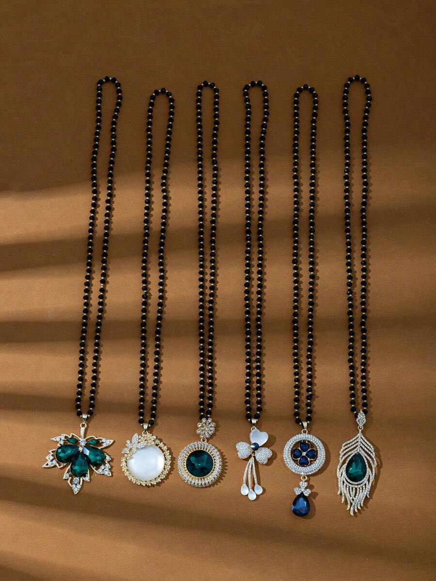 1pc Heart-Shaped Glass Beaded Long Sweater Chain With Various Style Feather, Maple Leaf, Clover Shaped Rhinestone Inlay For Women'S Butterfly Pendant Necklace