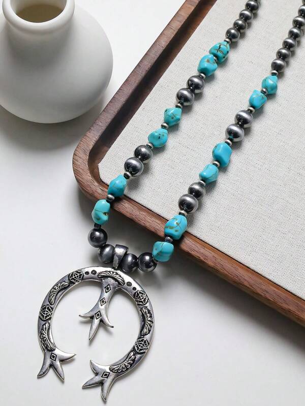 1pc Imitation Pearl & Ccb & Turquoise Irregular Shape Pendant Necklace, Sweater Chain
