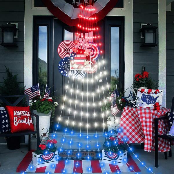 1pc Independence Day Decoration Outdoor Lights, 2M/6.56Ft Waterfall Tree Lights With 9 Drops 180Leds Red White And Blue 8 Lighting Modes , For Yard Patio Fireplace Party Birthday Holiday Decoration