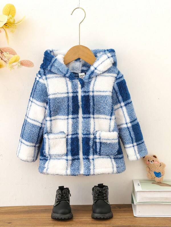 1pc Infant Boys' Casual Hooded Jacket, Autumn & Winter, Plaid & Plush, All-match Style