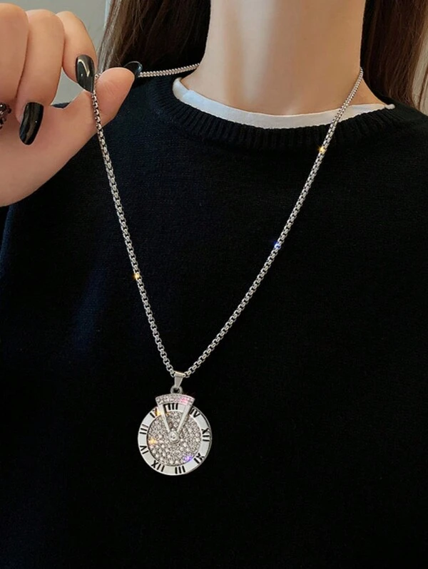 1pc Ins Cold Tone Roman Numeral Design Sweater Chain Titanium Steel Long Necklace For Men, Hip Hop Style With Rotatable Pendant
