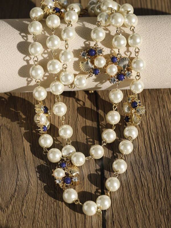 1pc Korean Style Fashionable European And American Vintage Pearl & Rhinestone & Shell Pendant Long Necklace, Suitable For Women'S Daily Wear
