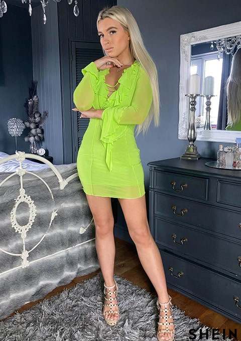 SHEIN BAE 1pc Lace Up Front Ruffle Trim Flounce Sleeve Bodycon Dress