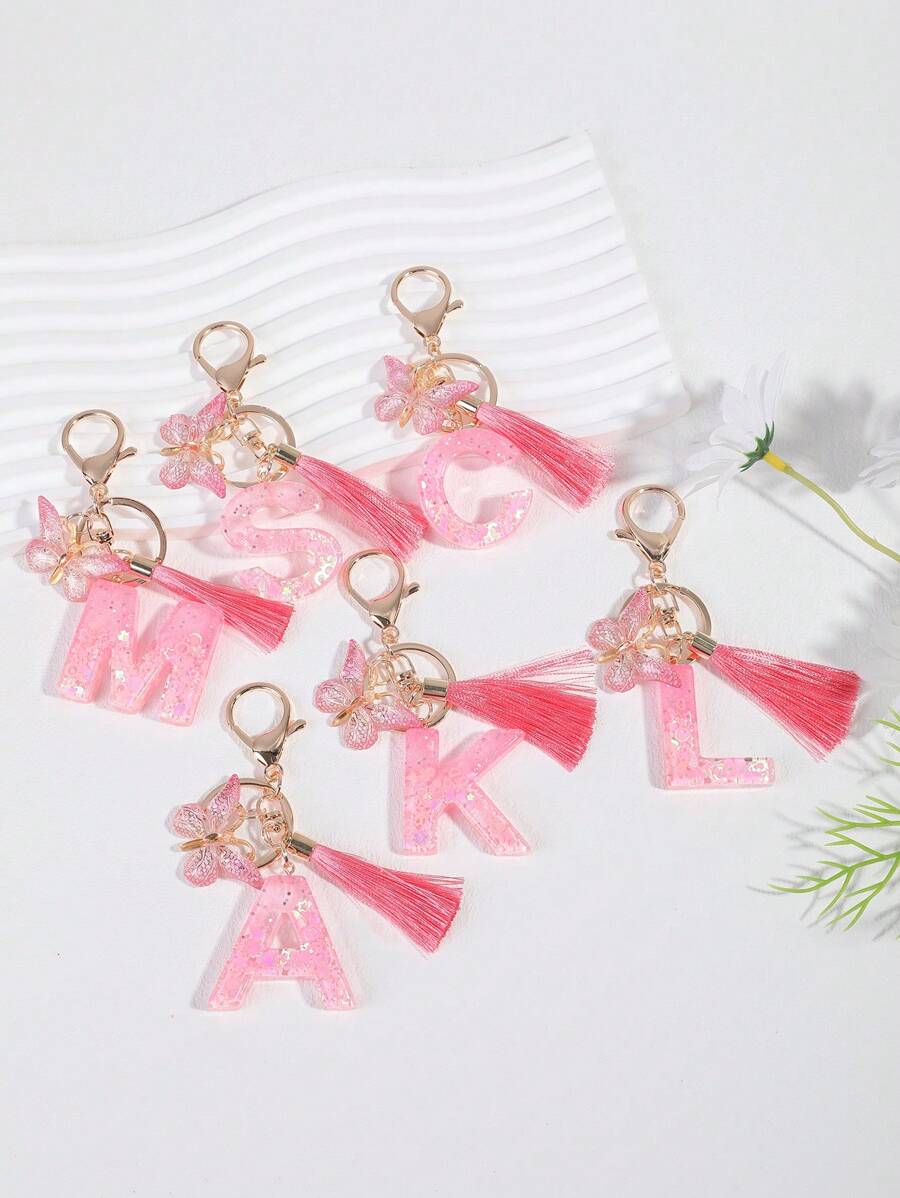 1pc Ladies' New Sparkling Glitter Alphabet Keychain With Crystal Drop & Resin Letter Fringe Butterfly Pendant, Gift Idea For Mother, Friend, Classmate, Relative, Lover, Bag Charm Keyring Decoration