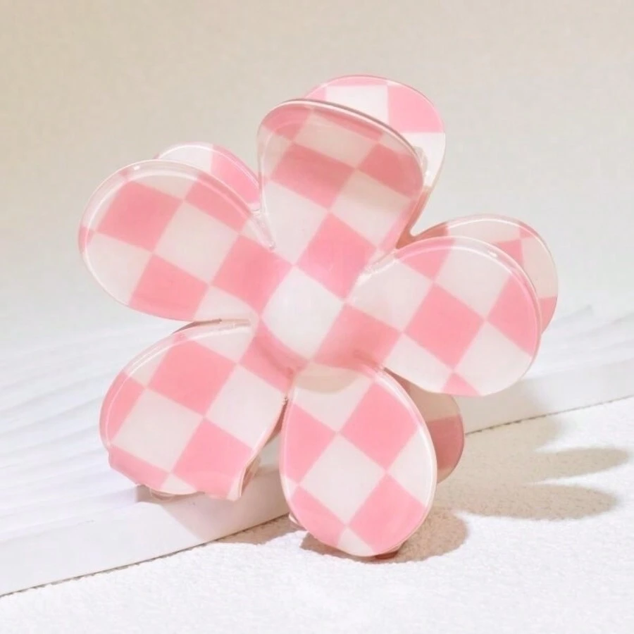 1pc Ladies' Pink & White Checkered Acrylic Hair Clip With Flower Detail, Elegant & Cute For Work