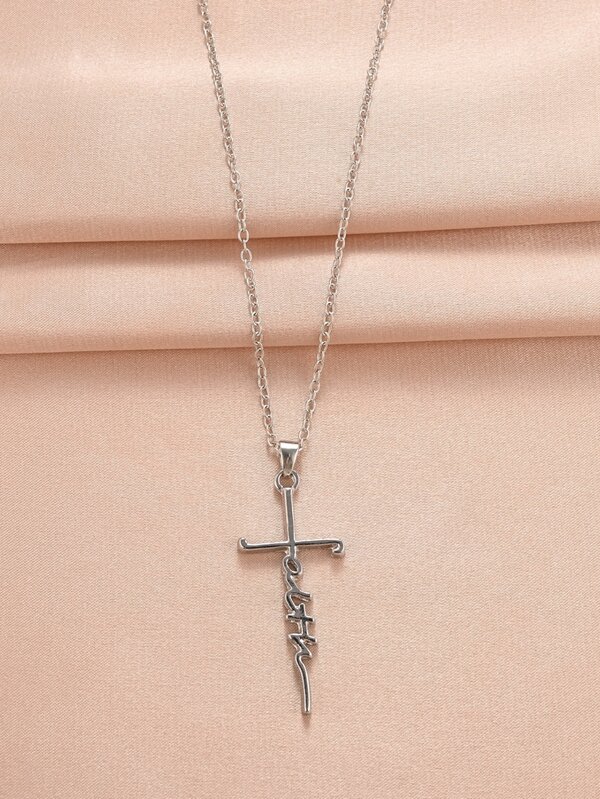 1pc Ladies' Zinc Alloy Cross And Faith Inscription Necklace