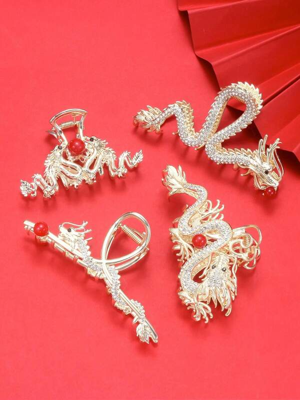 1pc Lady Hair Claw Clip With Dragon Shaped Design And Rhinestone Decor, Suitable For Thick Hair Ponytail Hairstyle And Chinese New Year Hair Accessory