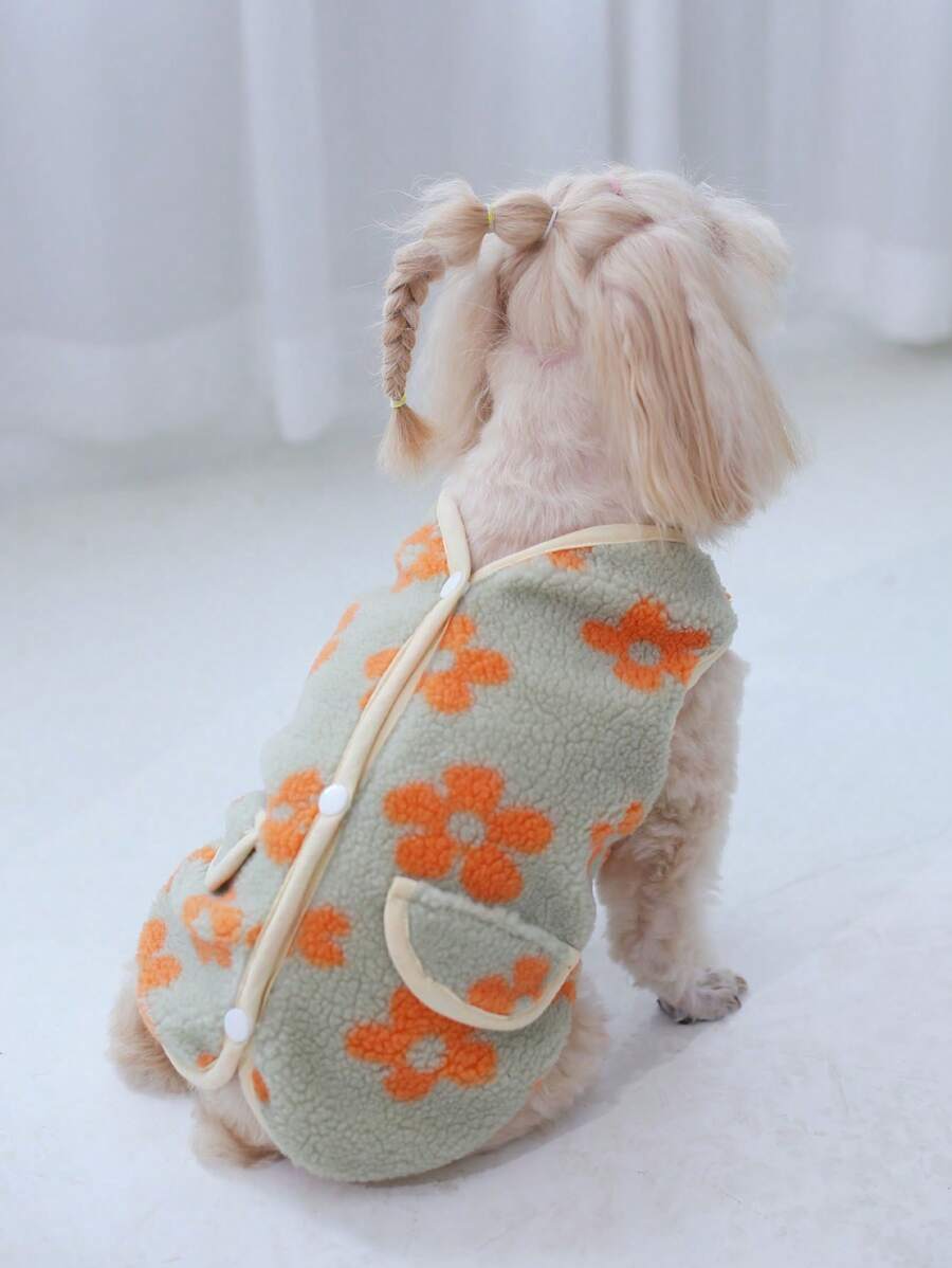 1pc Lamb Wool Cute Floral Chic Color Block Vest Coat With Back Button Closure And Pocket Design. Suitable For Small/medium Sized Cats And Dogs To Wear For Outdoor/indoor Activities In Fall And Winter