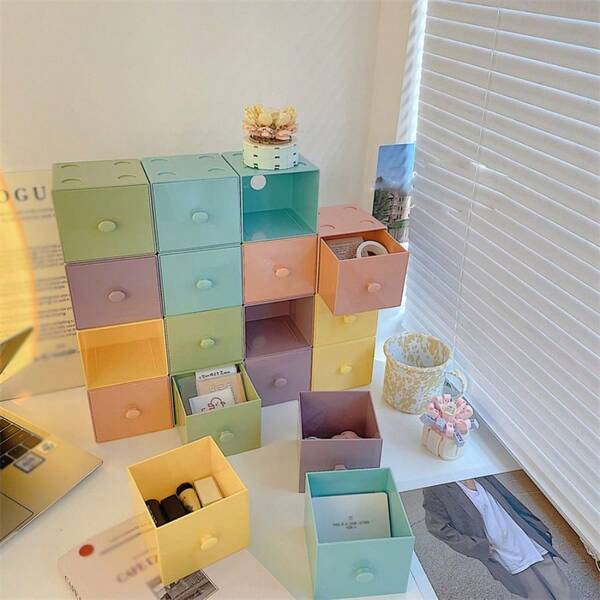 1pc Macaron Color Building Block Storage Box Wireless Stacking Desktop Drawer Type Combination Miscellaneous Storage Box Office Storage Box Student Dormitory Storage Box