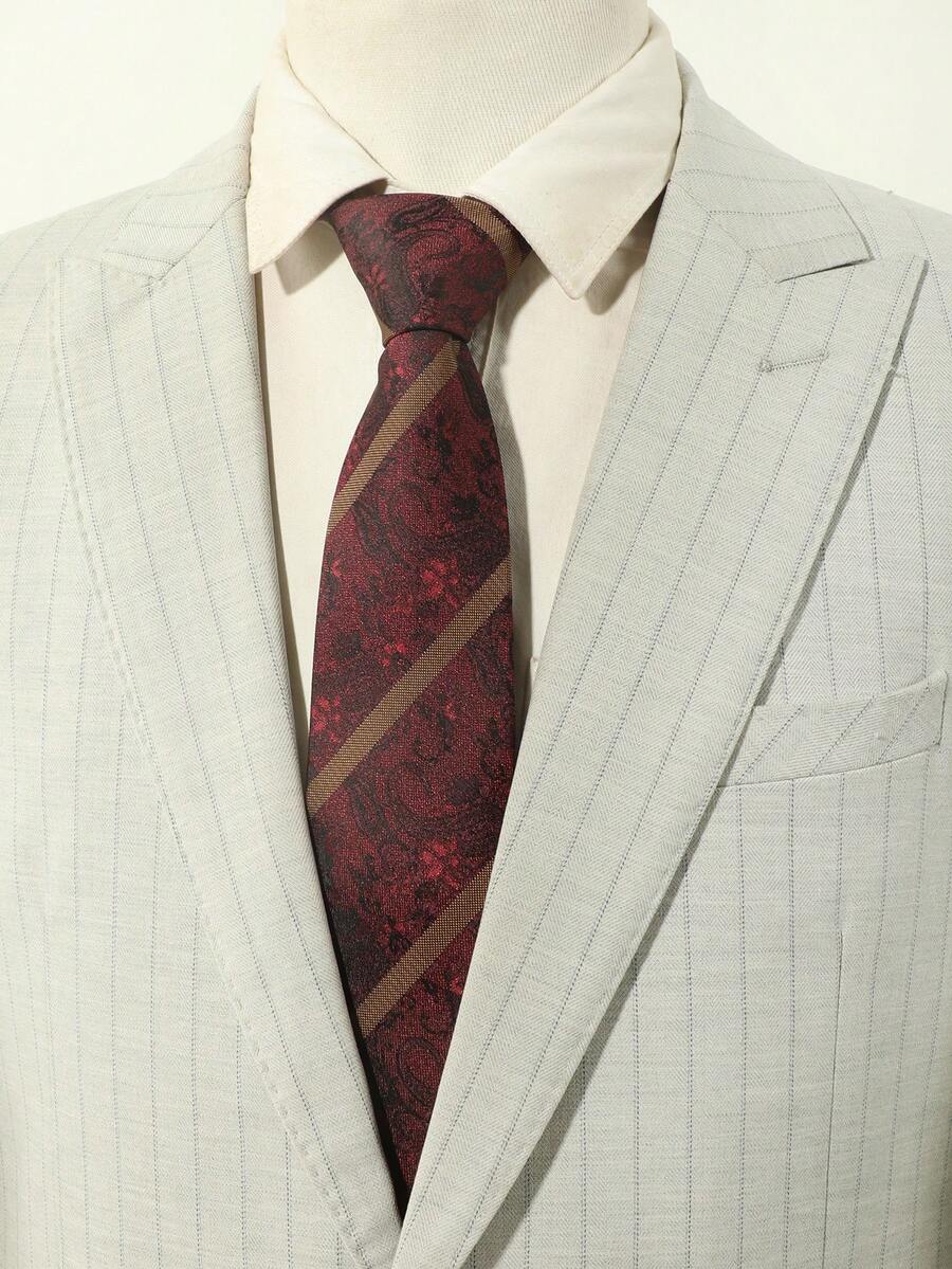 1pc Men's Casual Wine Red Necktie With Diagonal Striped & Paisley Pattern, Suitable For Party, Daily Wear