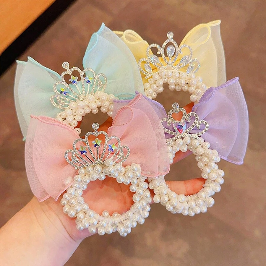 1pc Mesh Crown & Pearl Decor Hair Elastic Band For Girls