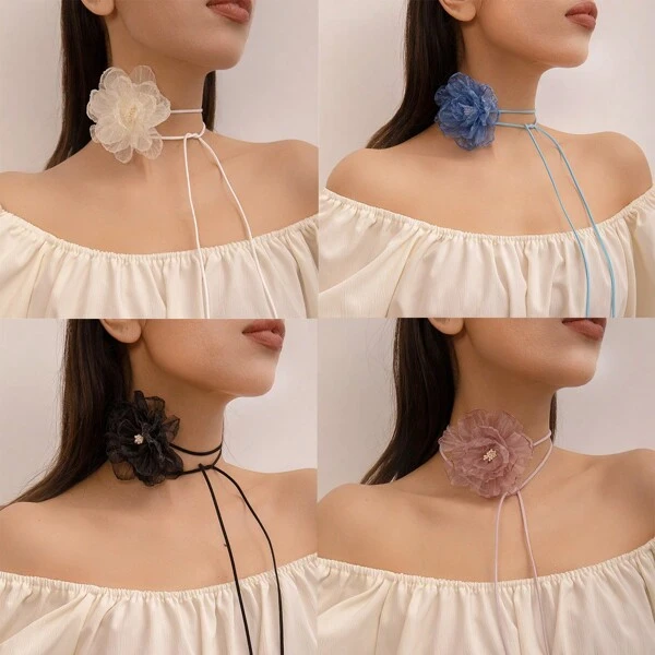 1pc Mesh Flower & Leather & Wax Cord Handmade Choker Necklace