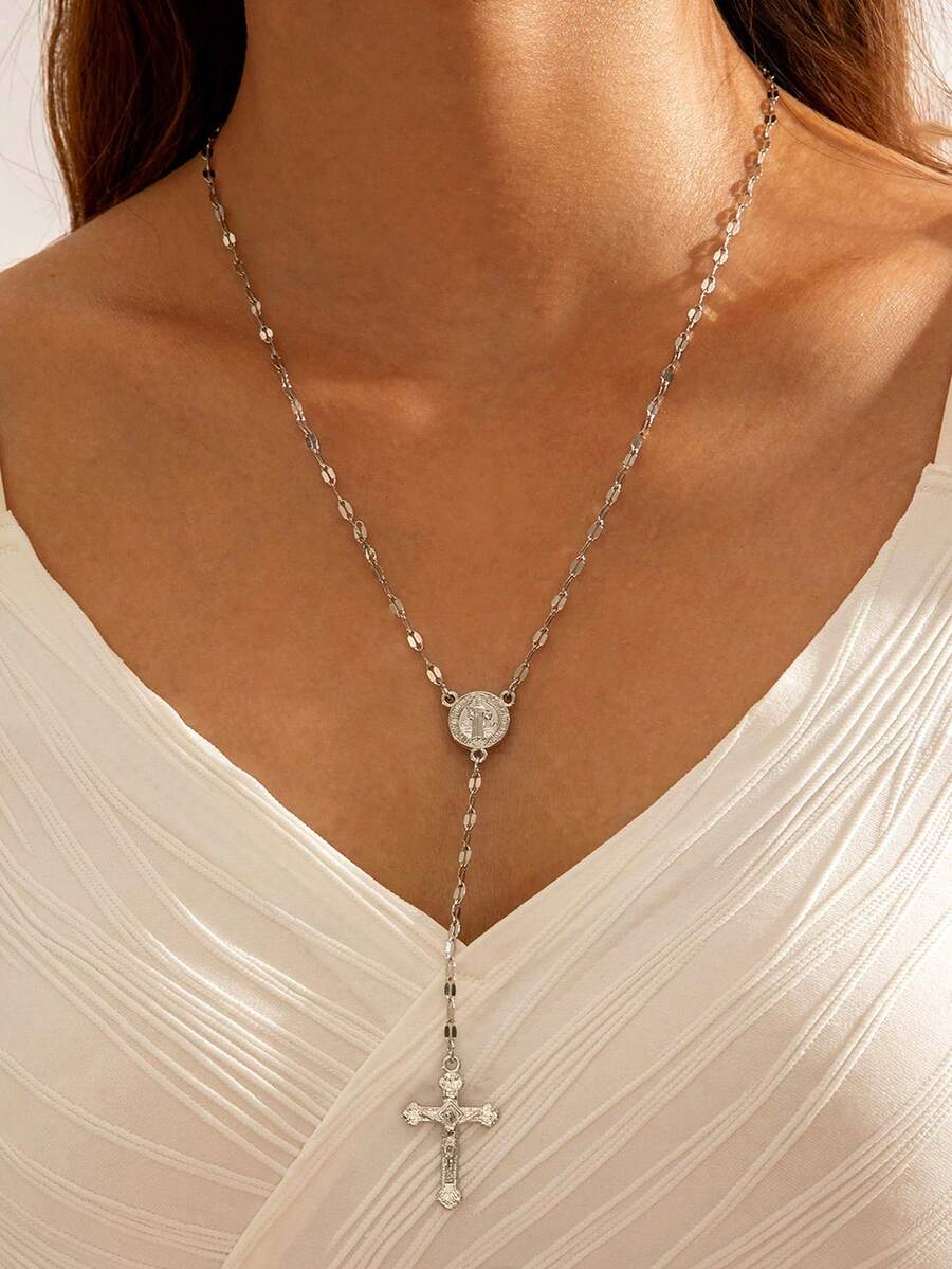 1pc Minimalist Y-Shaped Vintage Cross Pendant Necklace With Tassel, Versatile Fashion Jewelry Gift For Women, Suitable For Daily Wear, Parties And Dates