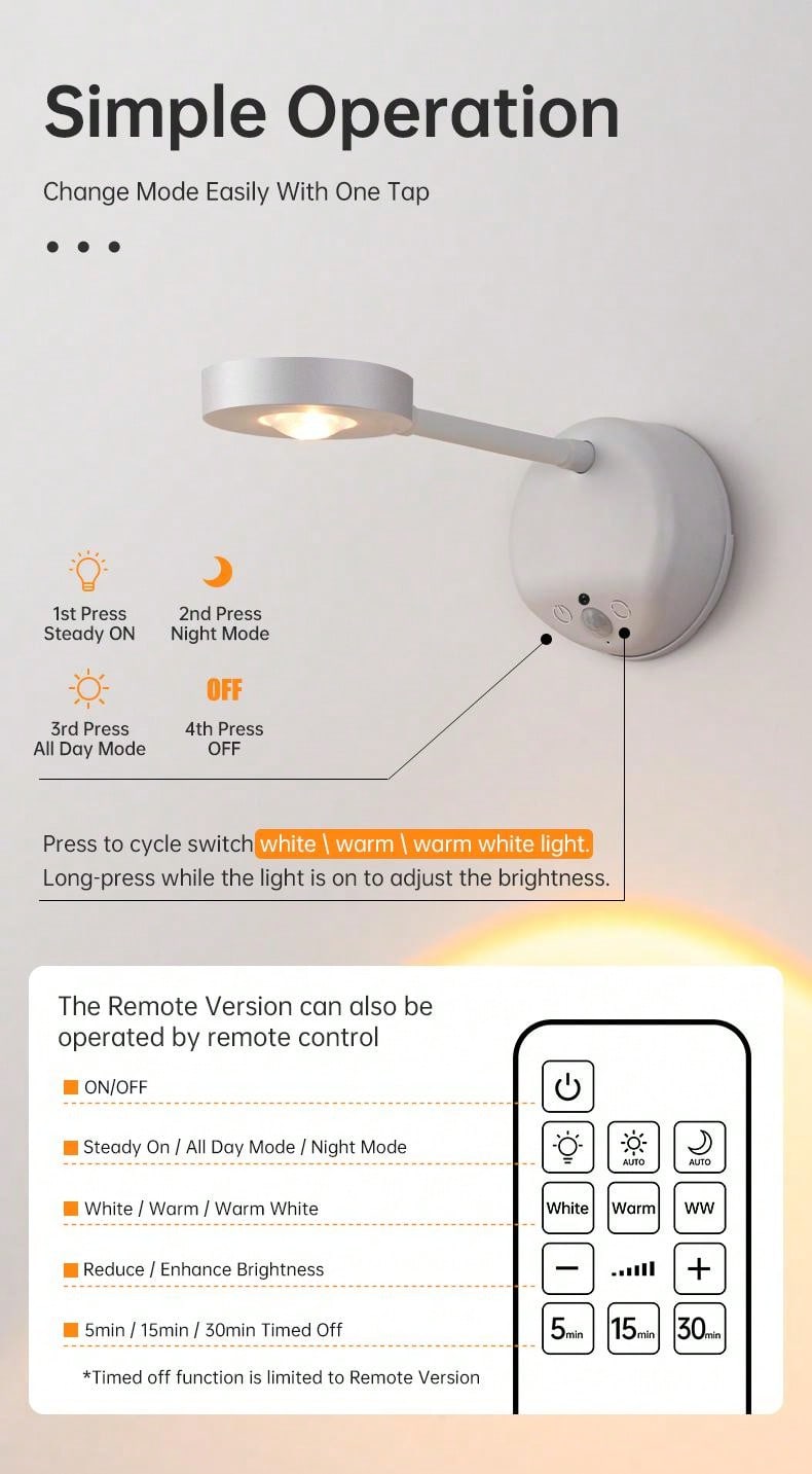 1pc Motion Sensor Led Light With Remote Control, Wireless Wall Monted Night Light, 3 Light Color Spotlight, Rechargeable Induction Wall Lamp For Gallery Display Showcase Wall Painting Hanging Photo