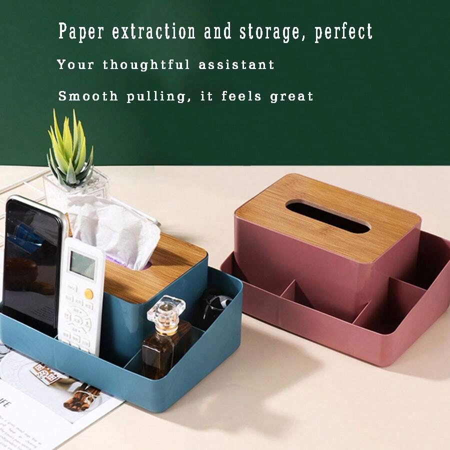 1pc New Style Tissue Box With Wooden Lid Plastic Remote Control Storage Case Living Room Desktop Organizer Multi-Functional Bedroom Tissue Box With Divided Storage Compartments