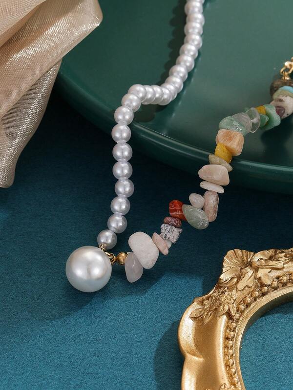 1pc Oversized Pearl Pendant Necklace For Women, Minimalist Fashion Colorful Turquoise Mosaic Pearl Chain Necklace