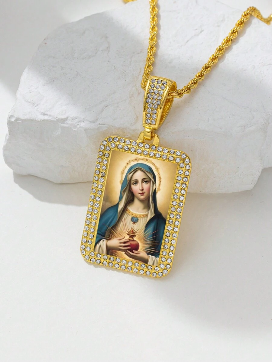 1pc Personality Faith Square Shaped Cubic Zirconia & Character Pendant For Women, Daily Wearing Christmas Prayer Necklace, 18k Gold Plated Stainless Steel
