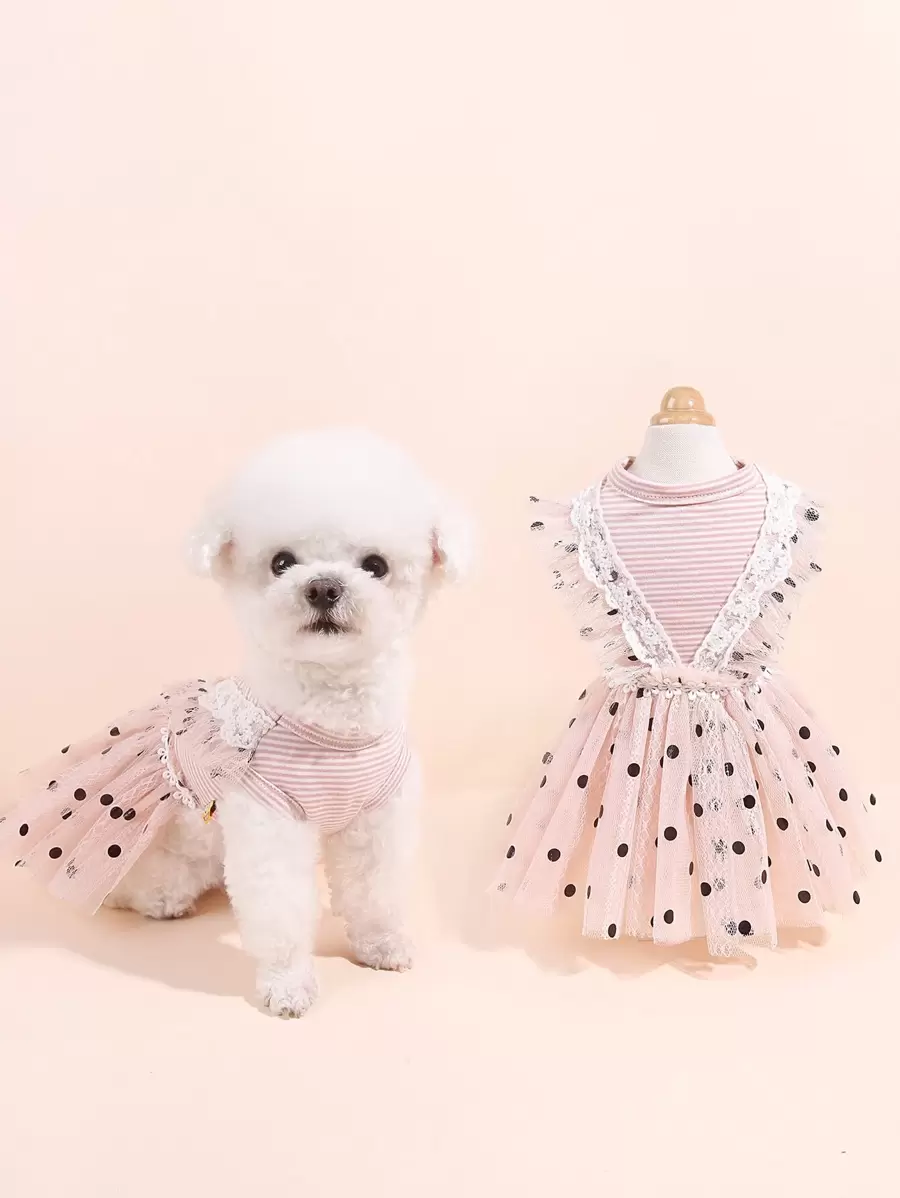 1pc Pet Pink Polka Dot Mesh Lace Dress With Bowknot Decor Suitable For Cat & Dog Summer Outdoor Activities