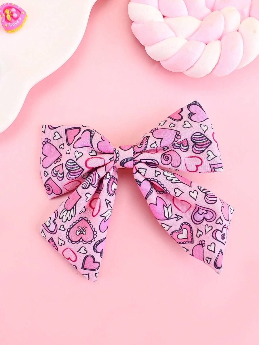 1pc Pink Heart-Shaped Printed Hair Clip With Bowknot For Kids