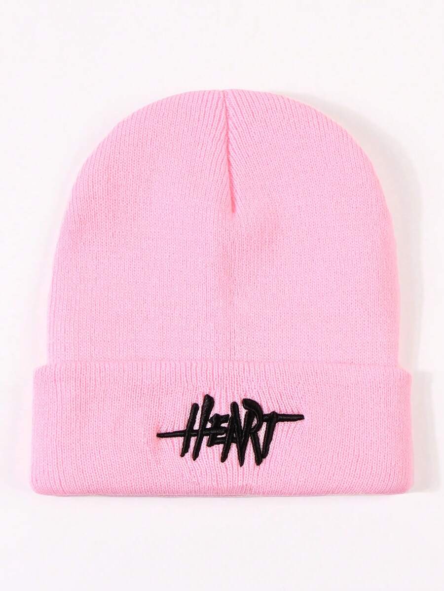 1pc Pink Knitted Hat With Embroidered Letter And Heart Design