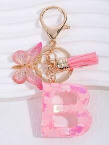1pc Pink Love Heart Sequined Letter E Keychain With Tassel & Butterfly Design For Women, Gift For Lover, Mother, Family, Classmate, Friend, Bag Accessories